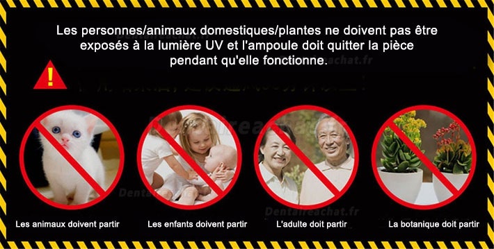 Les personnes/animaux domestiques/plantes ne doivent pas être exposés à la lumière UV et l'ampoule doit quitter la pièce pendant qu'elle fonctionne.