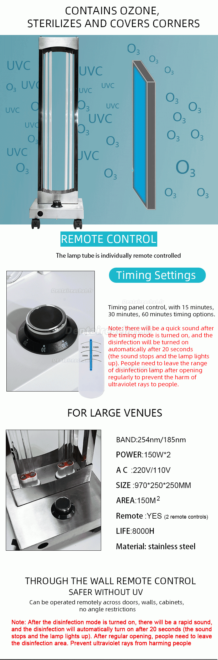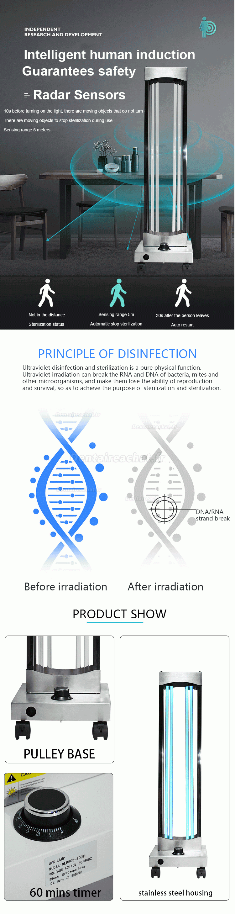 Avec la fonction de capteurs radar, si des personnes ou des animaux pénètrent accidentellement pendant le processus de désinfection, la lumière déclenchera immédiatement l’alarme et s’éteindra automatiquement. Il sera activé après leur départ.