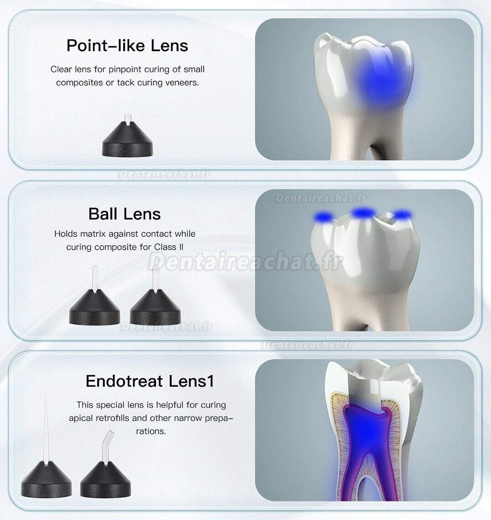 ① Lentille ponctuelle : lentille transparente pour un durcissement précis de petits composites ou des facettes à durcissement par points.