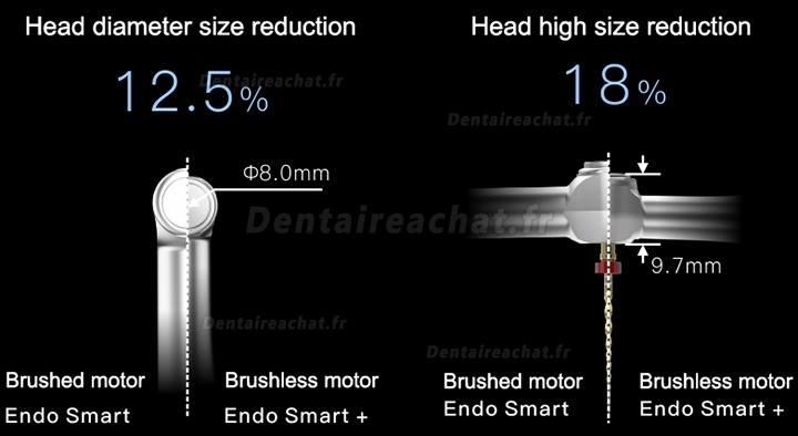 Le moteur Endo Smart + a un angle de rotation précis et permet une inversion automatique, ce qui aide à prévenir les fractures de la lime dentaire, ce qui se traduit par une plus grande efficacité de préparation.